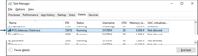 To confirm this has been the case, check that the POS.Gateway.Client.exe entry is visible in the Windows Task Manager and has a status of Running. To do this refer to the Confirm Resolution section for more information. If it is NOT visible, then refer to How To Run Touch As Administrator for more information.