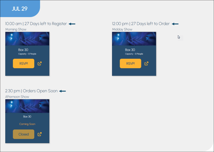 - Preview - Select to ensure the Session IS visible in the Event Portal. A status comment of Orders Open Soon will appear in the Events Portal. Patrons will be able to see their Sessions. However, they will not be able to register their attendance nor place Orders.