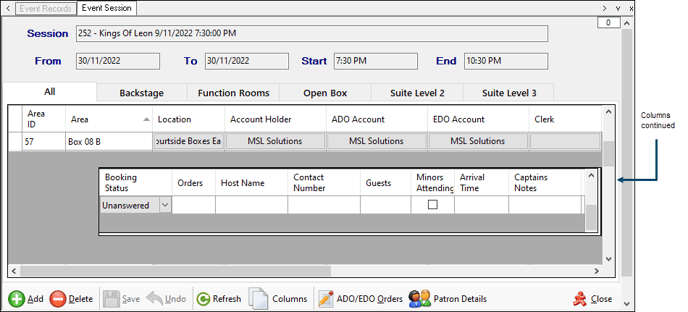 To access, select a cell in the Areas column in the Events Session section. Used to configure/manage Event Sessions. This can be done by adding/configuring/removing Areas associated with an Event Session. It is also, allows access to the Area Orders screen to facilitate the placing of ADO and EDO Orders.