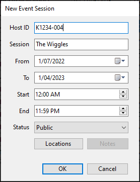 Once an Event has been created, a Session will also be created by default which will have the same ID, Name, From/To dates and Start/End times as it's associated Event. If, however, more than one Session is required to be created then it is recommended that the ID of each Session is suffixed with a sequence number representing each consecutive Session. For example: K1234-001, K1234-002, K1234-003, etc.