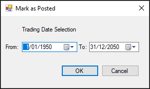 - Mark As Exported - Select to display the following prompt and select a range of Trading Dates to ensure all Supplier Invoice related data in the selected date range is flagged as exported.
