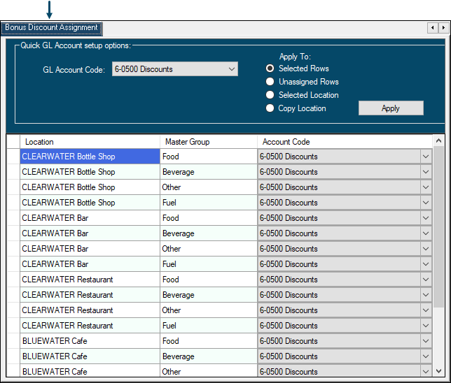 Used to assign/map Bonus Discount Accounts to SwiftPOS Location/Master Group combinations.