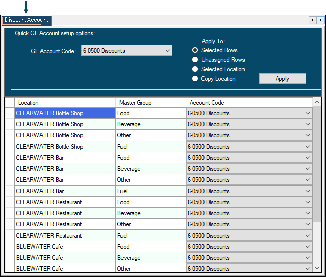Used to assign/map Discount Accounts to SwiftPOS Location/Master Group combinations.