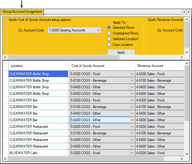 Used to assign/map Cost of Goods and Revenue Accounts to SwiftPOS Location/Master Group combinations.