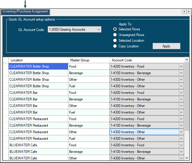 Used to assign/map Inventory/Purchase Accounts to SwiftPOS Location/Master Group combinations.