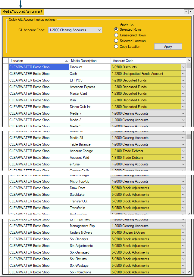 Using the Account assignment/mapping tabs to the right of the Account Setup tab, to assign/map swiftpos Location/Media, Location/Master Group and Location entries in the grid of each tab, to the appropriate Account Code (as configured in the Account Setup tab). This can be done by using the Quick setup options available in the header section of the tabs, or by selecting from the drop down list of Accounts, listed on the right hand side of the grid, in each of the tabs.