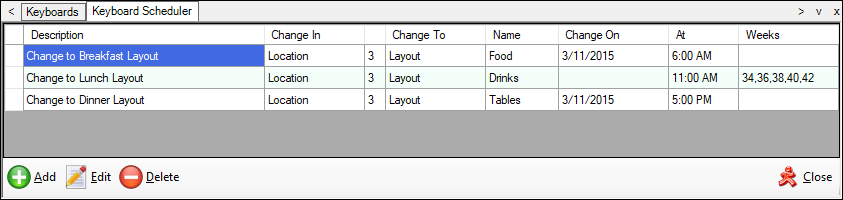 The Keyboard Scheduler is used to schedule changes in the display of Keyboards or Layouts at predefined times in a specified Location or at an individual Touch Terminal. For example, this can be useful for Venues that want to display Breakfast/Lunch/Dinner Layouts at different times during the day.