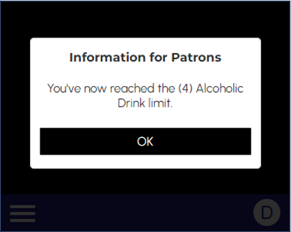 - Max Allowed X In Sale - Used when a Venue wants to enforce the responsible service of alcohol by limiting the number if alcoholic drinks sold per Order. For example, a Limit of 4 alcoholic drinks per Sale.