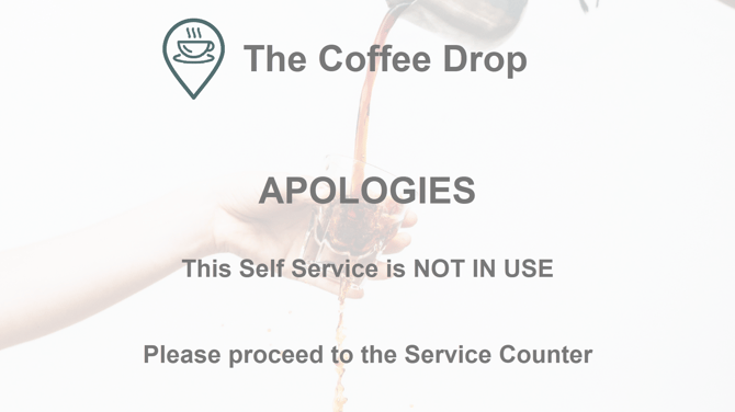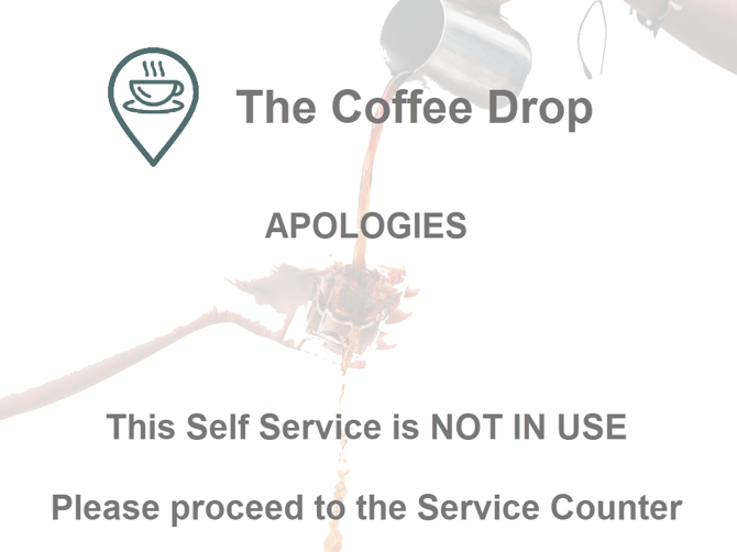 The Self Service Out Of Service (Locked) Layout is presented when the Self Service is locked. This is usually achieved by selecting the Lock Terminal option in the Basic Tools menu or, if configured, the Lock Self Service POS Key in the Admin Layout. This Layout is automatically generated when the Self Service option from the Style drop down list is selected. Refer to Out Of Service images for more information.