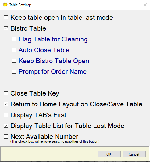 - Return to Home Layout on Close/Save Table - Select to return to the home layout whenever a Bistro/Standard Table is saved or finalised.