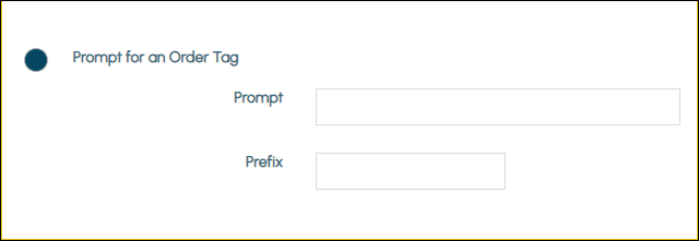 - Prompt for an Order Tag - Select to prompt Clerks/Staff for the entry of the patron's location in support of the delivery of the Order. Once entered, this information will be tagged to the Order. Select to display the following fields: