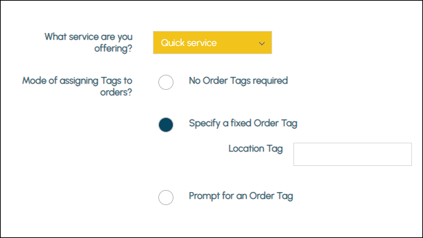 - Specify a fixed Order Tag - Select to specify a fixed location the Touchmini device is assigned to. For example, the Table number to which the Touchmini Tablet is assigned. Once entered, this information will be tagged to the Order. Once selected the following setting will be available:
