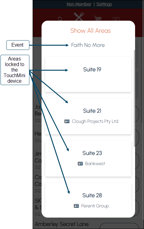 Event Areas will only be displayed when there is an Event Session currently in progress and the Touchmini is assigned to a Location that is associated with the same Event Session.