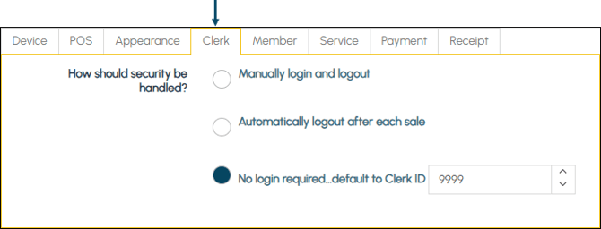 - No login required... default to Clerk ID - Select to ensure Clerks/Staff Members are not required to login. This will however require a Default POS Clerk to be configured. For example, 9999. Refer HERE for more information.