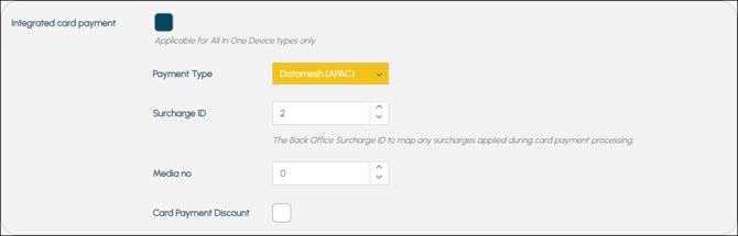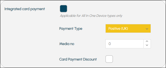- Integrated Card Payment - Only applicable for All In One Device (AIOD) types. Select to allow for card payments to be made using an All In One Device approved for use. Once selected the following options will be available: