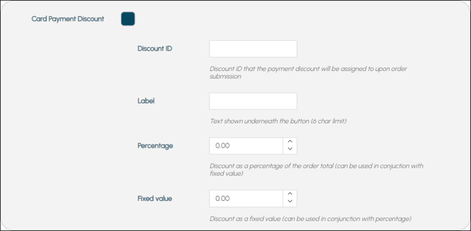 - Percentage - Displays/Set the percentage of Discount to be applied to the total value of the Order. For example, 10%. This can be used in conjunction with the Fixed Value.