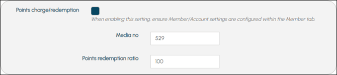 The Points charge/redemption option will only be visible if Allow member sign in option has been selected. Also, paying with points must cover the total of the whole Order. Partially paying in points and then paying the remaining amount using another payment Media is currently NOT supported.