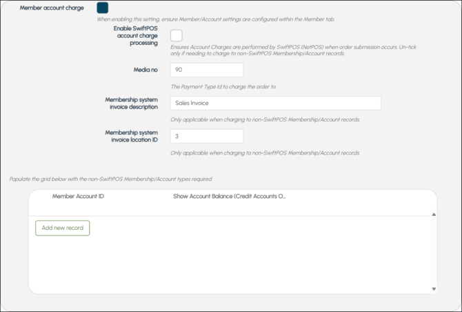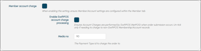 - Enable Swiftpos account charge processing - Select to ensure that Orders paid for by charging to an Account are processed by Swiftpos and posted to the Member's Account. Once selected the following options will be available: