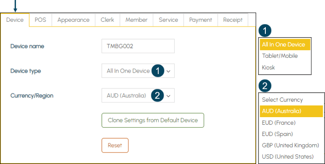 - Currency/Region - Select from the drop-down list the Currency (Region) that is applicable to the Location in which the Device is going to be used.