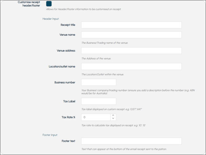 Customise receipt header/footer - Select to allow for the customising of the Receipt header/footer information. Refer HERE for more information. Once selected the following settings will be available: