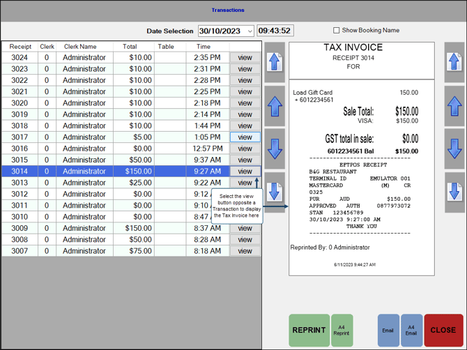 - A4 Reprint - Select to reprint a receipt in A4 format or alternatively select F7.